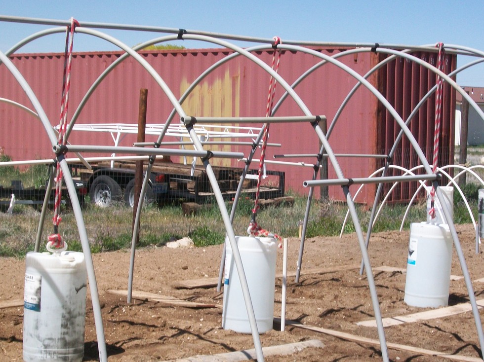 3, 18 gallon barrels filled with water to 16 gallon mark, approx. 135 lbs each.. anchor for the big frame,, and passive solar heat for the greenhouse, tied down with 3/4 inch nylon rope