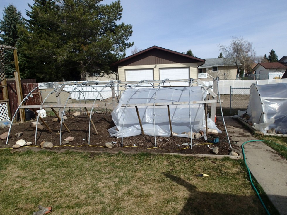 Pumpkins are back in the patch in the backyard. The big greenhouse has been up for two weeks and the soil was nice and warm. Saturday, the 110km/h winds took it apart. Good thing there were no plants in the ground yet. I put in a smaller one underneath. Inside, I have a 2032 Mathison, with a 1499.6 Dettweiler as a backup.