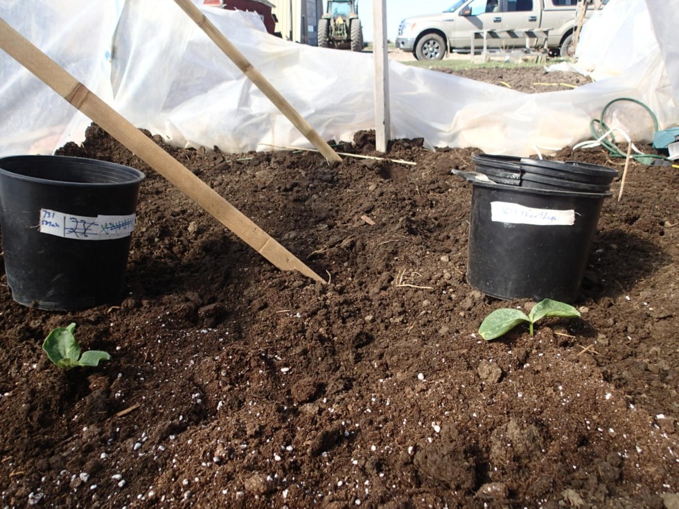 Andrew isn't growing this year, so I've got more space for my own plants. We had 3 plants in the main patch at the farm for the past few years. I've taken it down to 2. On the east growing to the west, I have the 1813 Northrup, and my 731 Makarchuk as a backup for my extra pumpkin. The extra squash is growing to the east. I put in an 800 Neily, with a 1094.6 Butler and a 1094.6 Butler. Alanna may take over one of these plants in the next few weeks. She's unsure at this time. The grasshoppers last year really freaked her out. However, Alanna and Alex will be growing long gourds out at the farm. Those go in the ground in a week or so.