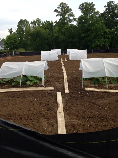 Had to cut sides out of hoop houses to let early kins run. Later kins picking up speed and looking well. Gave them all shot of Talstar and Daconil this evening and got fence put up. Started batch of tea for watering tomorrow.