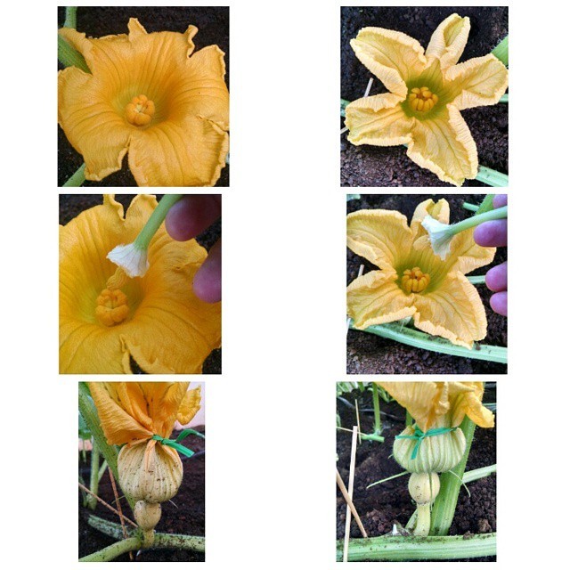 I've been watching these two female flowers very closely the past several days...although I was hoping these would open next month it was sure fun this morning watching them open...plus it smelled soooo good as I sat in my pumpkin patch!!! Anyway, so as you can see I hand pollinated them...Hawkley is on the left and 1008 Cook is one the right...I notice that Hawkley has a bright orange flower and 1008 Cook has a pale yellowish-white color flower...curious if there will be a correlation between flower color and pumpkin color...anyone know or wanna guess what they will end up looking like?