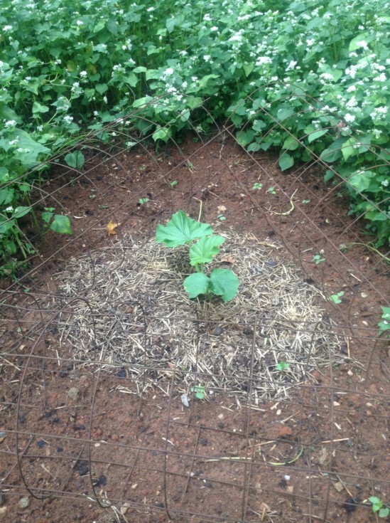 This is my 1381 Tobeck (1985 Miller x 1409 Miller). It is my late plant. That's buckwheat growing around the pumpkin. It will be tilled in as the plant grows. Thanks for the seeds, Cindy.