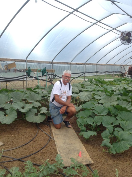 The 2008 Neptune is the other plant growing in the greenhouse. John is kneeling near the stump.