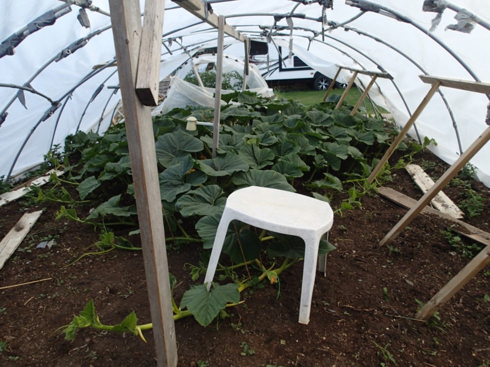 It's been really warm and dry the past little while. All I do is water and water. Here's the 2032 Mathison. I had the first female open at 14 feet on the 14th and crossed it with the 1813 Northrup. I have another one opening at about 16 feet in a few days. I need to keep the hoophouse structure up all through the summer for shade cloth and storm protection. This may be interesting positioning the vines compared to the posts for the hoophouse.....