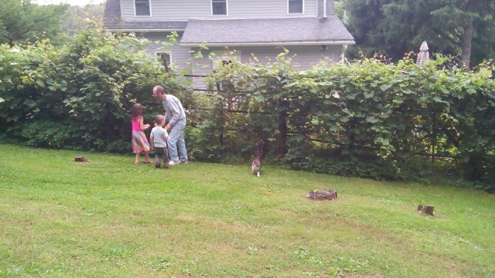 Dad Madison and Deegan picking black berries in the grape arbor in the yard..