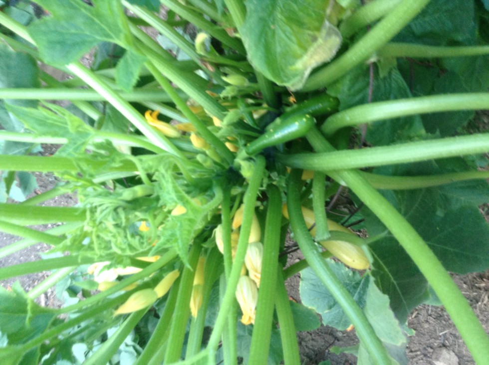This is straight neck yellow squash. Two plants are growing side by side, one is healthy and throwing yellow squash. The other has become infected and is now throwing green squash and the new growth is deformed. No amendments have been added to this area in three years. The ag agent tells me mosaic virus can be spread by insects and especially cuc beetles.