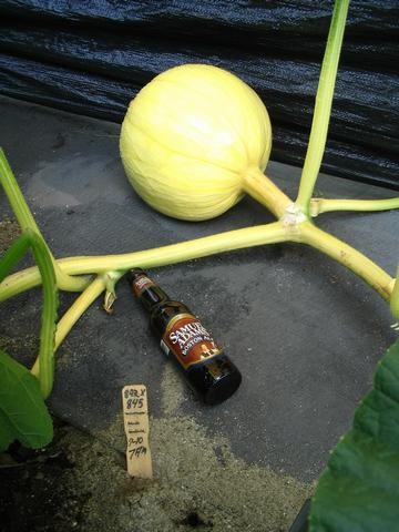 After several bad pollinations & a couple aborts, we finally have a main set fruit on the 842 Eaton. This is E5 pollinated on 7-10-04 so this is day 12. Taping at 30"C. A small stem stress crack was discovered this morning.