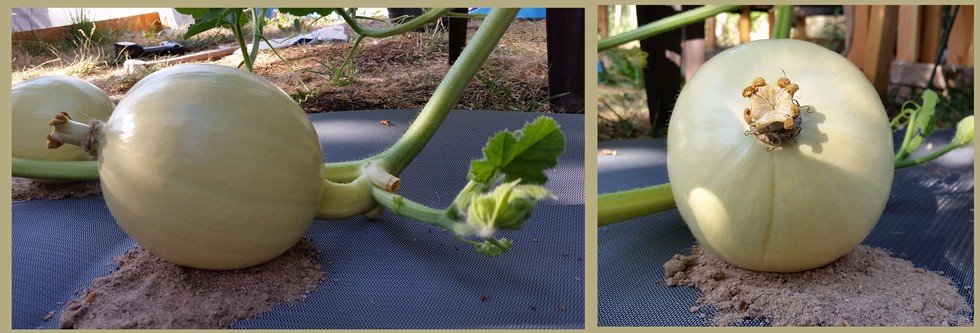 Pumpkin #2 has a curve in its stem and its blossom is pointing upwards. I will need to tilt the pumpkin and lift the vine to correct this. Pumpkin #2 is also more spherical and a little taller. There appears to be a scar below the blossom that I believe was caused by young leaf stalk. Its secondary vine refuses to grow.