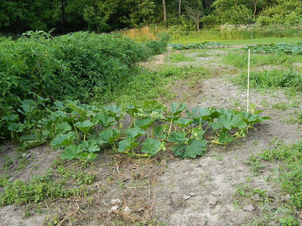Volunteer that came from last year's Survivor. That one won't give up: survived a flood, mice ate into the pumpkin and it rotted, seed on the ground all winter, planted when I tilled for tomatoes. It came from Joe Scherber's Colorado state record, which grew in the toughest climate around. I just had to let it grow.