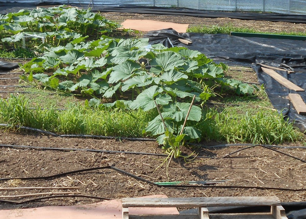 Seems like I have a right handed plant as the secondary vines on the left side are slow to develop even though there are vines there with growing tips but the growth has been slower on the left side for whatever reason. I have full confidence that it will fill the area with time but at the moment the plant is asymmetrical. Also, I probably should weed the edge that my weed block just does not quite reach;-) This shows how effect (and what a time savings) the weed block actually is.