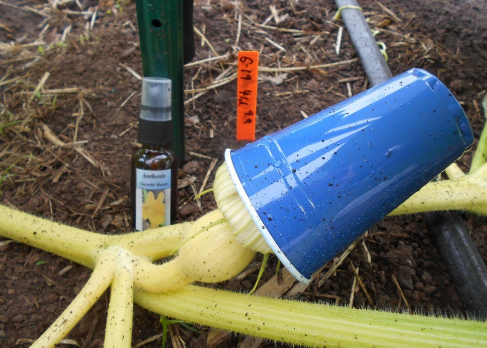 This shows the stage of development you want to apply the �Anthesis� spray that I developed. This is a pumpkin that was pollinated 48-hours ago. As you can see I use blue plastic cups to cover the flower to prevent bees from making my crosses impure. This pumpkin is under an umbrella which is also helpful due to the rainy weather patter we have been in recently.