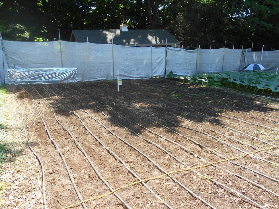 This shows the area I provide for each of my pumpkin plants. The dimensions are about 32ft wide X 30ft. long. I use the yellow rope to mark the edge so I know when to terminate my secondary vines. Even though the plant is gone I will continue to leave the SVB (Squash Vine Borer) pheromone trap up to help reduce the local moth population.