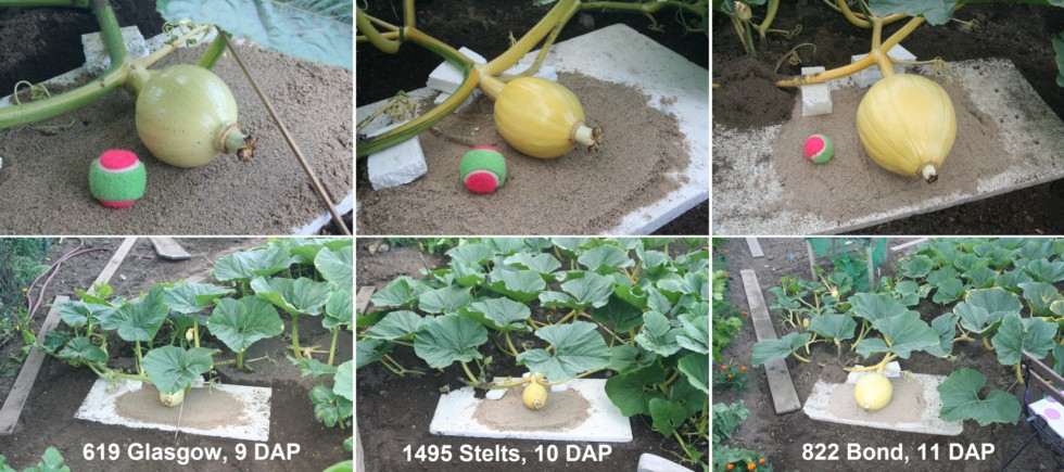 Today I placed the first 3 out of 6 pumpkins on sand before they get too heavy. The 1495 Stelts seems to develop the color I want to see with a pumpkin on a 1495 plant :-)