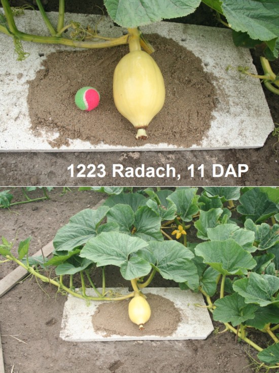 Today the pumpkin on the 1223 Radach plant was placed in the final position. In this case I�ve terminated the main vine right after the fruit and I�ll try to let this secondary from the pumpkin�s leaf node continue as a new main vine.