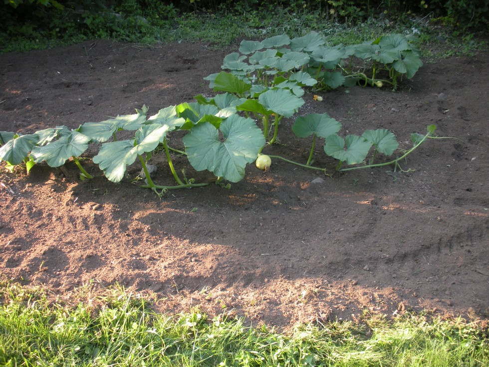 My son Abel's plant, a 525 Wolf. This one went in the garden on June 14th. I had planted the seed back in early April in a 1 gallon pot. I kept trimming it back, to keep it small. It was definitely pot bound! There is a small fruit on the main vine that has a big scar on it because my son hit it with the hoe when hoeing it. This patch receives a lot of shade, but Abel is still hoping he can grow a nice looking pumpkin around 500 pounds or so.