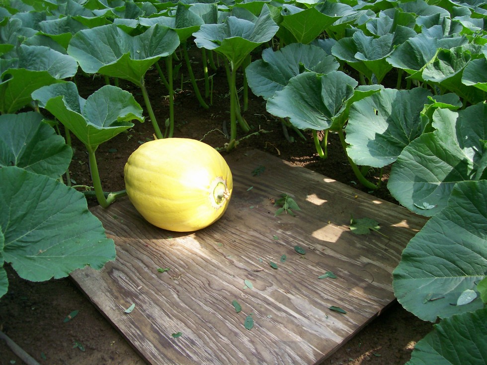 823 Rahe pumpkin. Day 15. Est 45lbs. The plant has filled it's allotted area and all but 2 vines have been terminated.