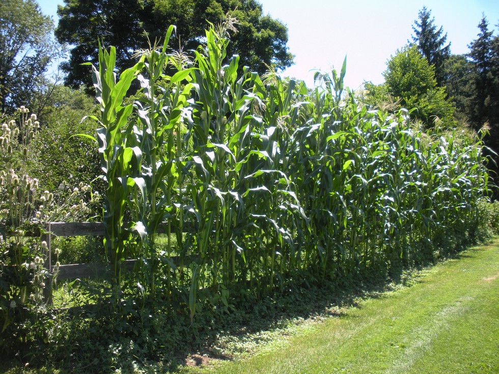'Boone County White' tall corn from Sandhill Preservation Center. The fence in the background is 5' tall for a reference.