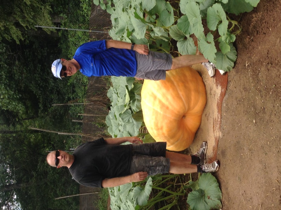 It has been a tough year in the pumpkin patch. We started 11 pumpkins with the intent to cull down to 5. Disease has culled us down to 1 lone hope. The 1530 Gehweiler is growing well for us. This picture was 11 days ago. The pumpkin was taping 632 then. This past Friday she taped 764. Bruce and I started this year "chasing the quad" (1000 lb mark). Now we're just chasing a scale. We're flying on a wing and a prayer, but if we can hold her together we might make 1000 yet. We've been fighting all kinds of issues all season with this plant, but it's late August and we are still in the game and that's something to celebrate.