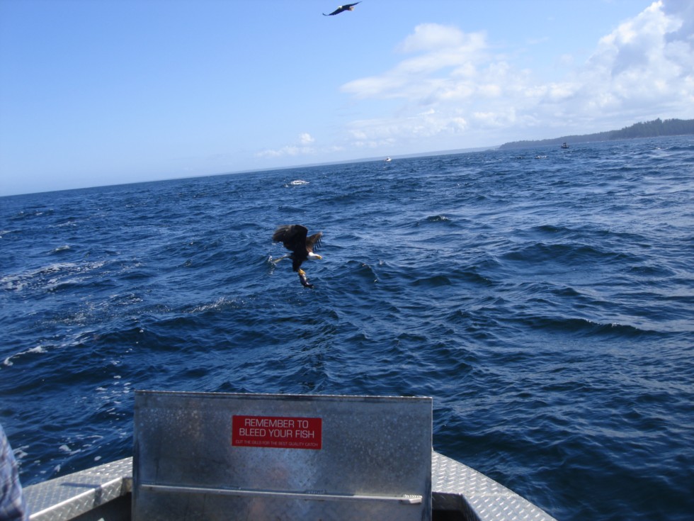 I got the attention of some eagles holding a Black Bomber. He did his lookout pass and I threw the fish behind the boat and he swooped back and got the fish you can see the 5 pound fish in his talons.