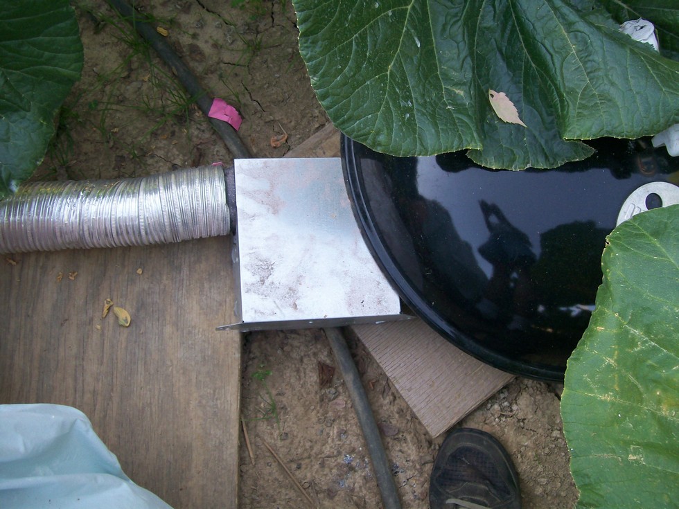 Since it's close to kin I didn't have a lot of room to work with so I extended the flex hose to the back of the pumpkin and connected it to a cheapy bathroom exhaust fan, it's propped up off the ground with wood. I then covered the fan with the lid off of my grill to keep the fan dry.