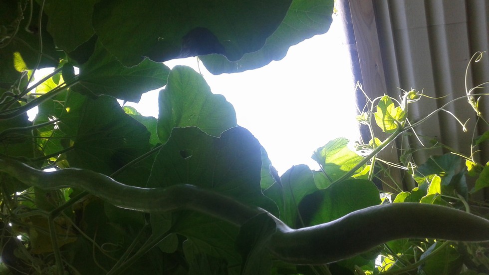 58" today. A week ago I had three long gourd 13" long they have all shriveled up. Today something banked me on the head. It was a long gourd six feet from the ground and 58" long. Where it came from I don't know.