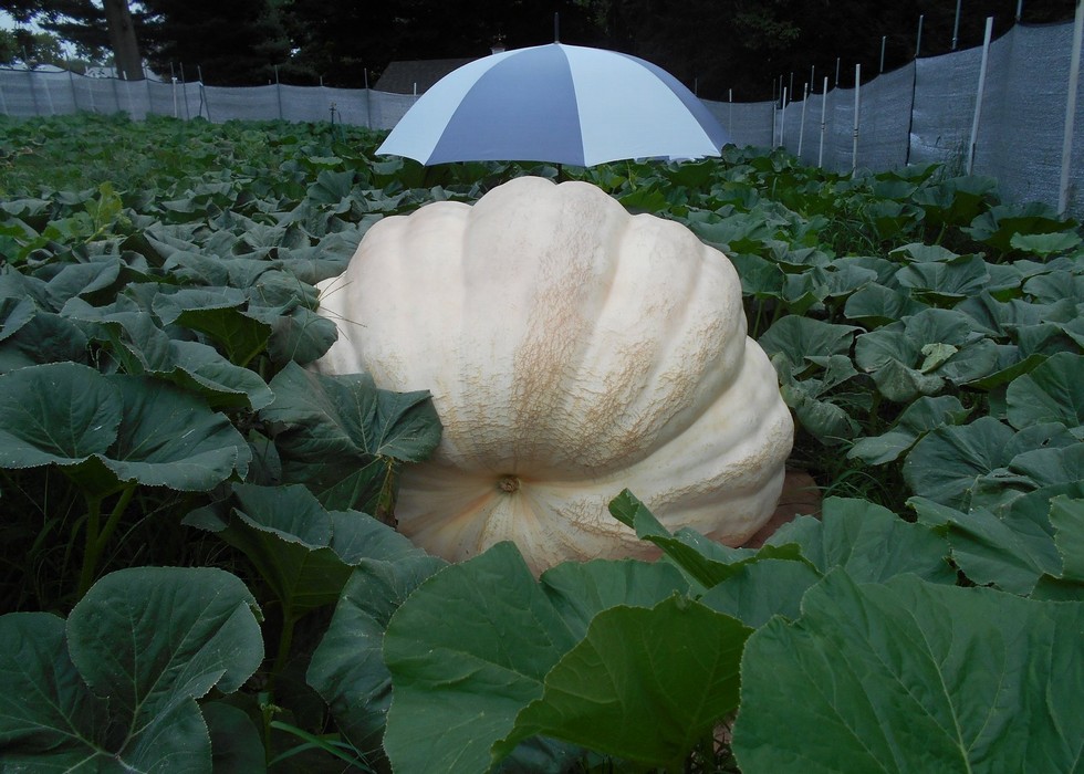 I have seen this seed produce a wide variety of shapes and colors, but it looks like my offspring will favor the round and white characteristics. (I was hoping for some orange color, but it does not look like this is going to happen.) This pumpkin reminds me of what the actual 1916 Barron looked like, so hopefully I will get the same percent heavy;-) When I measure my pumpkins, I measure to the half-inch, and what was surprising was that this pumpkin and my 1676 Daletas pumpkin measure exactly the same in OTT (Over the Top) measurements.
