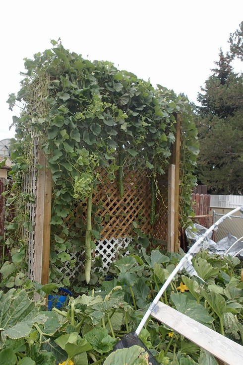 My best grower this year was the long gourds. Ok, I only had one really good gourd. Too bad I'm talking in the past tense. It hasn't put on any length in the past 4-5 days. I should have cut it off. The rain didn't help things......
