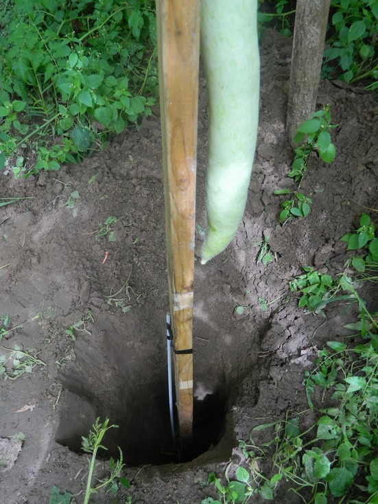Bottom end of the gourd and the hole. The fiberglass pole is to keep the board from moving. I use electrical tape because it will stretch as the gourd grows.