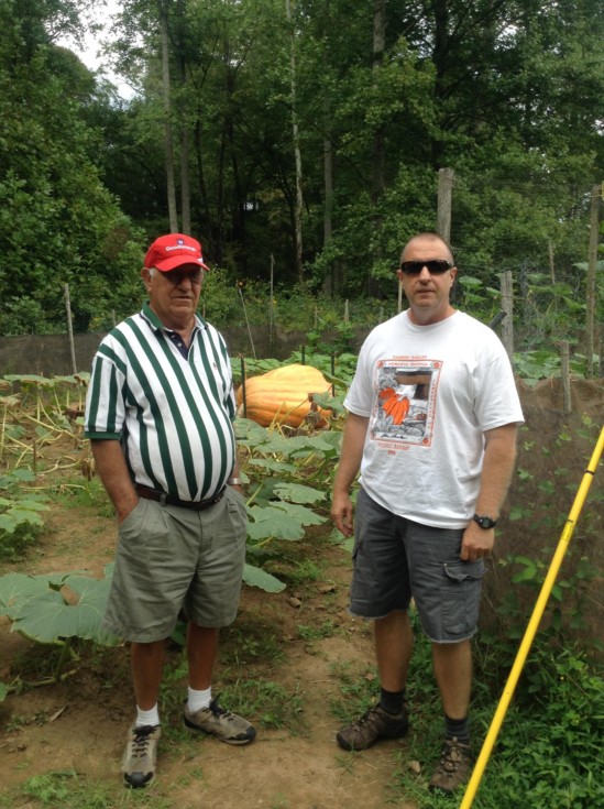 My friend CL Hyatt and me with the pumpkin in the background. CL grew a pumpkin this year that got to about 300 lbs, but it split on him when a big storm came in late in the season and dumped too much rain on the plant. CL enjoyed watching the pumpkin grow and says he wants to try again next year.