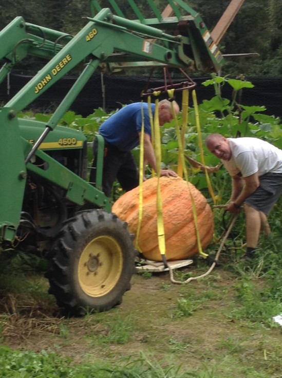 Hooking up one of Gail's pumpkins to take to the Stokes County Fair. It was taping 444 lbs. but went heavy at 529 lbs. Congrats, Gail.