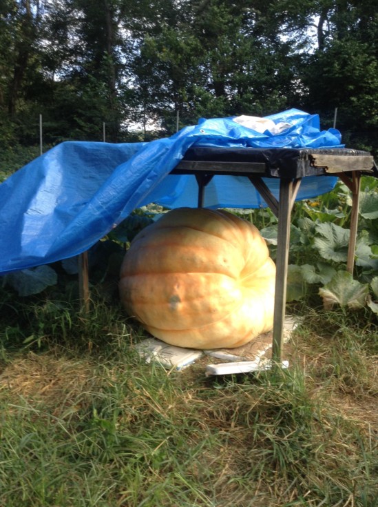 Gail has several nice pumpkins growing. This one is closing in on 800 lbs. and is very young. Gail is very excited about this one, and rightly so.