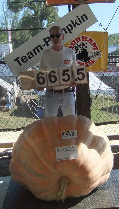 Flatnorm weighed his 150 sq ft contest pumpkin at the Durham Fair. Very happy with 665.5