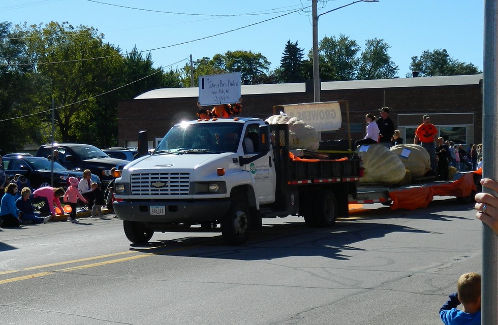 The top 3 pumpkins get to ride in the parade down Main Street. John and Merri Barlow rode on the flatbed truck with the Pumpkin Master, followed by Scott Steil and Cody Jacobus on the trailer.
