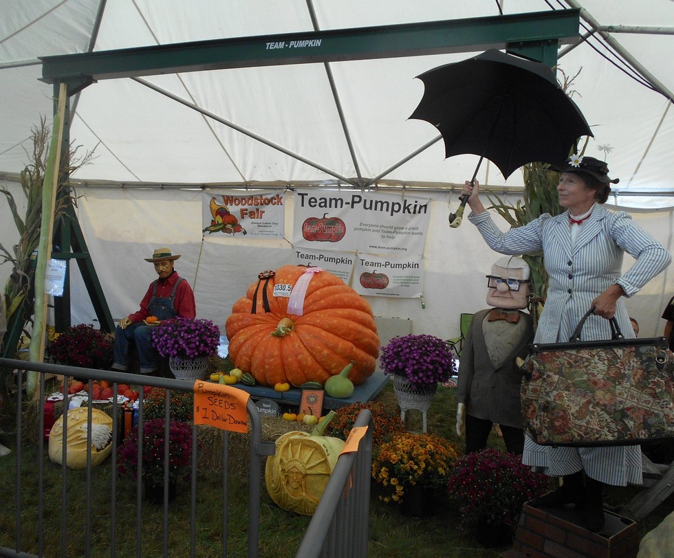At the Woodstock Fair we do not necessarily highlight the heaviest pumpkin, but we put the Howard Dill winner on prominent display. In the pumpkin tent we have more than just pumpkins, we also get a lot of visitors and in some cases the visitors are living statues. In this picture we have �The Gold Guy� and �Mary Poppins�. We also incorporate the scarecrow display/competition and the Old Guy from the movie Up �Carl Fredricksen� was enjoyed by many. This was a great Fair and marks the unofficial start of pumpkin season in the area. I would like to say �Thank You� to everyone that makes this event possible.