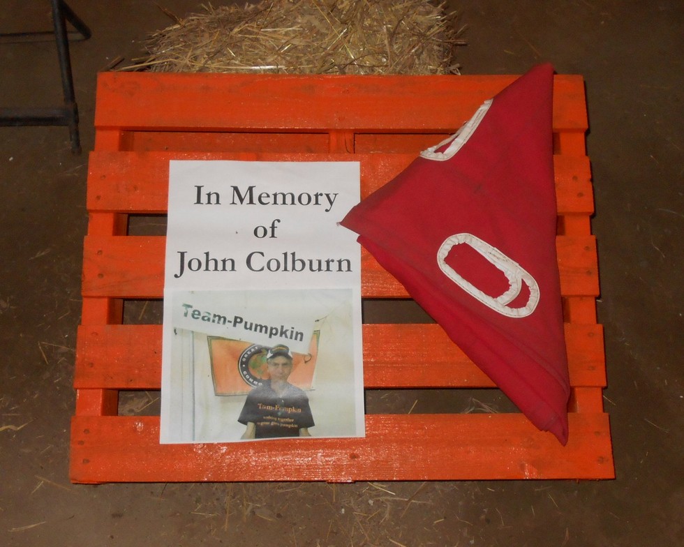 During this season we lost the long time pumpkin grower John Colburn. The Team wanted to acknowledge him in some way but were not sure how. The idea came up to have an empty palette on display in his honor. Since John also liked the orange pumpkins the special recognition palette was painted orange and a folded lifting tarp was also added. This set-up was placed within the giant pumpkin display just as if he had an entry.