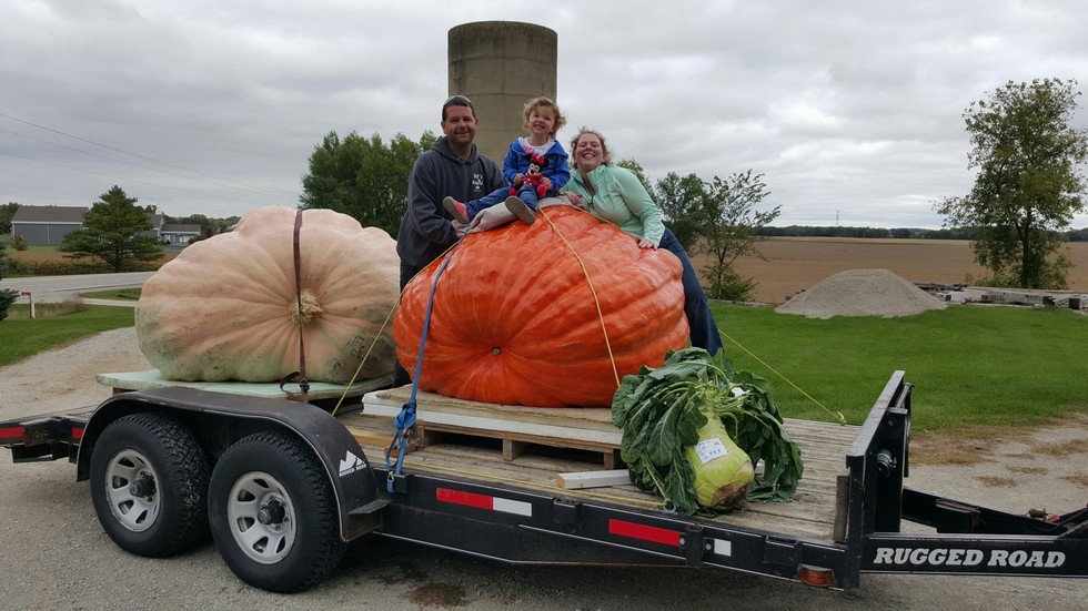 the bright orange one is my aunt debs pumpkin grown off her 1626 D.Gantner 14.... she crossed it with marks seed... should be hot... we are going to run a seed test on this pumpkin to see if it has mosaic or poty virus present in the seeds.... she won the howard dill award in Nekoosa this year with this pumpkin..... oh yes the other pumpkin... well that one was grown by the martins... oh yes that's a 2000 pounder...lol...