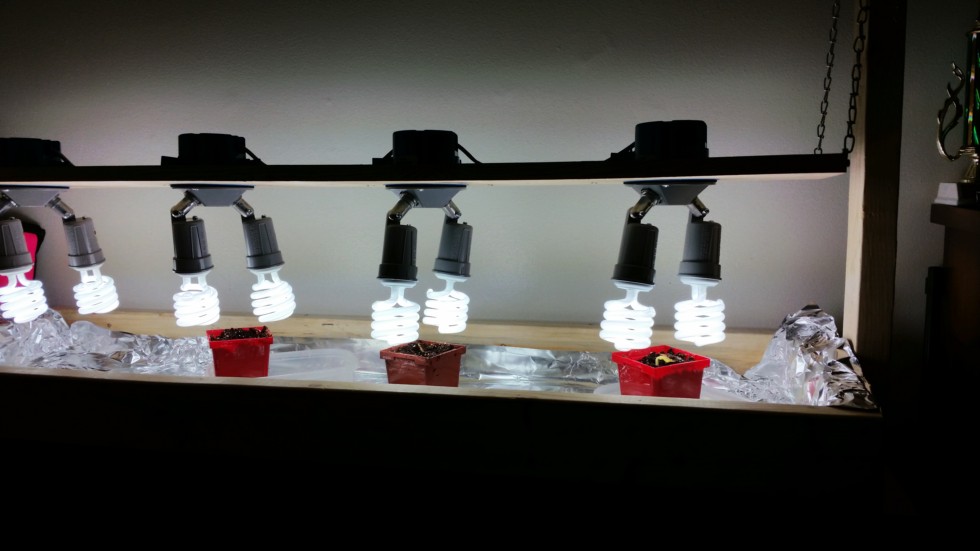 Grow light set up, a different brand of 100 watt eq cfls fit the fixtures, after I grow these out I'll see how it works and run a test from seed to transplant time, so I can stay on schedule