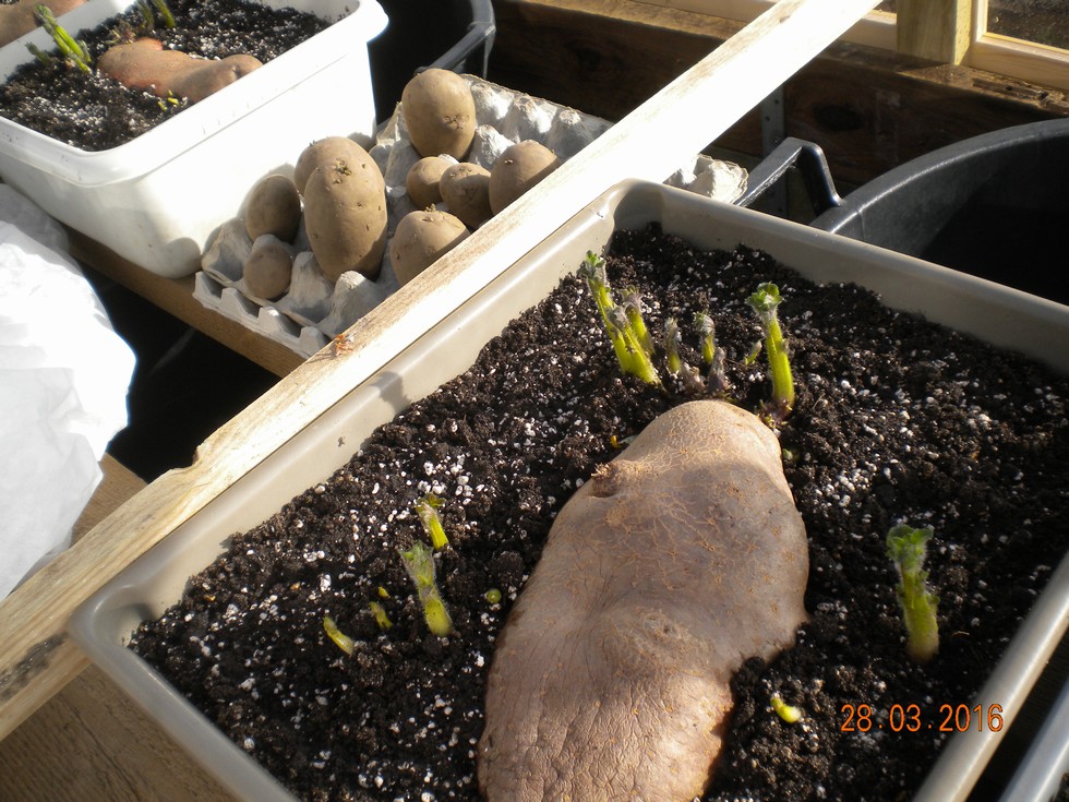 Moved my chitting seed Potatoes out of the barn into the new frame which will have more light. Will have to cover over with fleece every night in case of frosts.