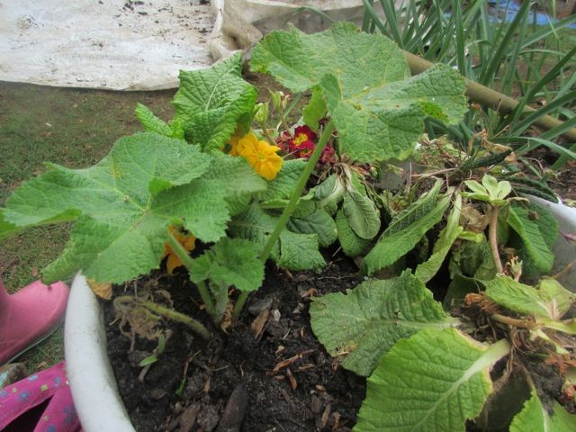 A volunteer squash of some type coming out of the flower pot. It will quickly learn the value of vancouver real estate, especially with it's atlantic neighbor!
