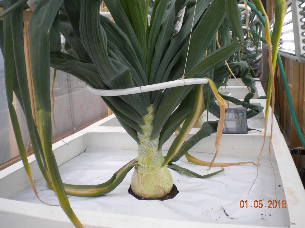New frame Onion has grown well during April, 11.3high x 17.0inches circ. 21 leaves. This growth has been at the expense of a high heating and lighting bill because the weather has been worse than the mild winter.