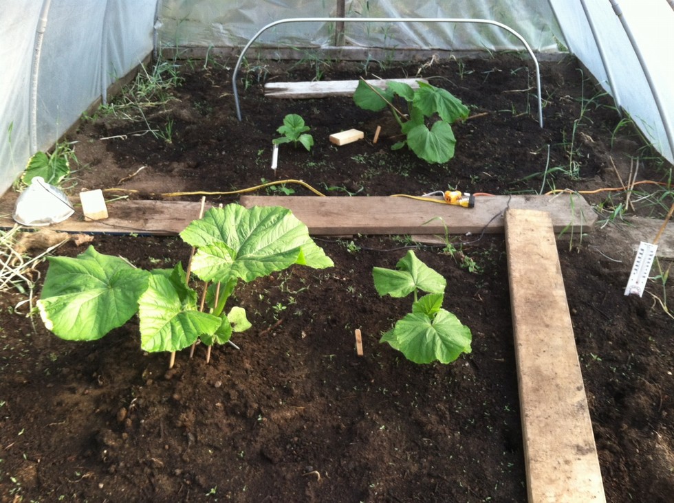 Inside the greenhouses this morning. I started two sets of plants one week apart. You can see the difference one week makes.