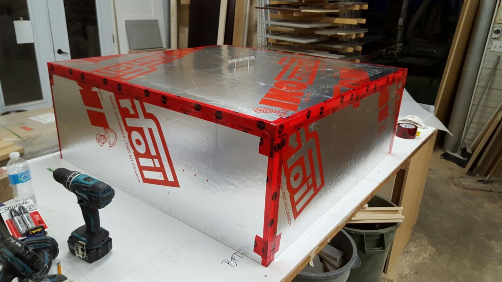 The long term forecast has some cold nights for the foreseeable future. It just feels like one of those years, but I want to try and fight through the weather. I know I have great heat rising from my heat cables, so with this 3/4" foil board insulated box I should be able to hold that heat inside the box all night. One 4x8 sheet makes one insulated box...a bit of tape and we're done. 44"x 44" heat chamber for the plants and it weighs about 1 pound.