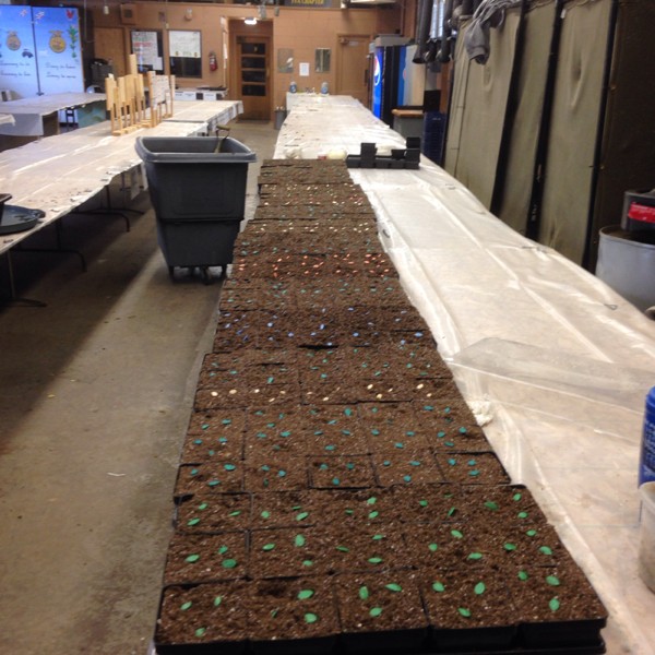 200 plus pots of commercial jack o lanterns seeded today. They will be real work in a couple of weeks when it's time to plant them. Made it safely through the frost last night.