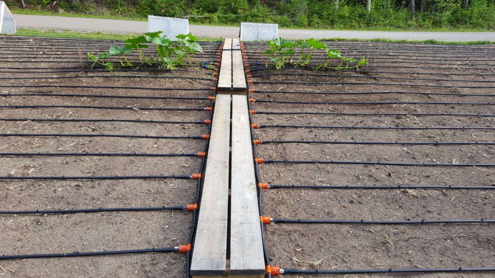 There's 2500 feet of 1/2" tubing over the three plots. 1500 emitters. The tubing is much more durable than the drip tape and should be around for many years.