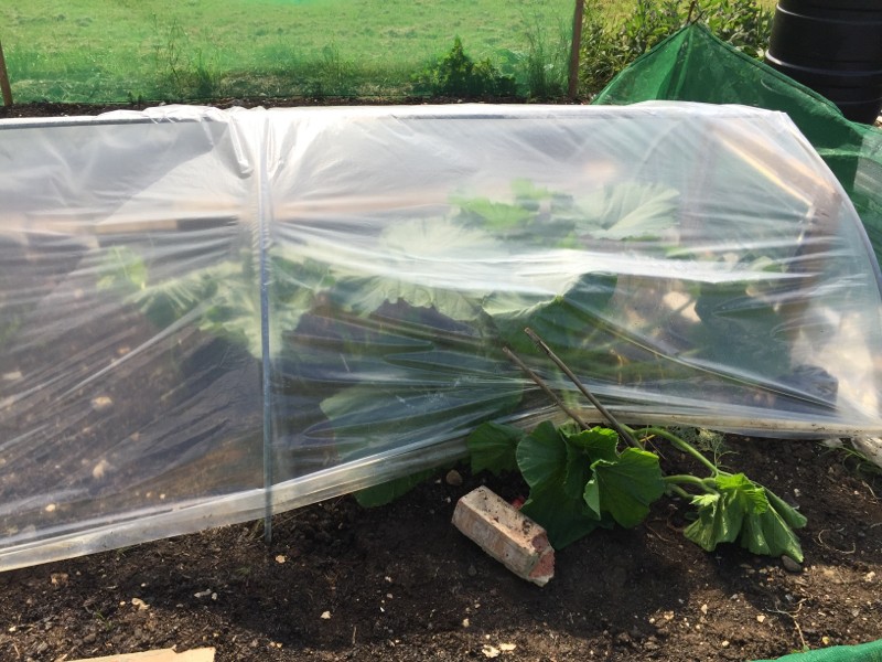 Ansems 1297 - a bit unexpected, the side vine is making a break for it outside the cloche at 2ft 3. Cloche is 6ft wide and 11ft long, but plant offset to accept backup. Main vine at 5.5ft. Placed windbreak to try and stop wind catching that opening, and will try and centre cloche over new growth.