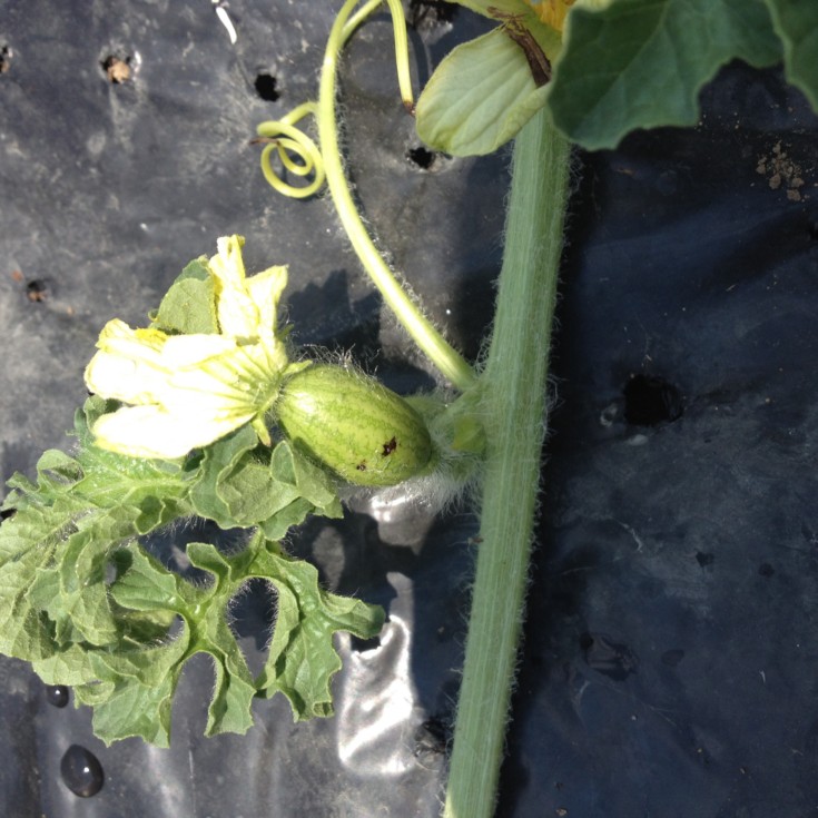 Pollinated this female on our 267 Edwards. About 9-10 feet out on main vine. A lot of odd growth on main vine on this plant so maybe this melon swells up fast. Cross is 267 Edwards x 290 Mudd.
