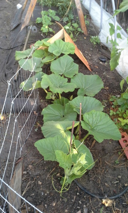 Pumpkin is starting to run better than it was. Greenhouse is coming down, nights in the 50's. First female bud is forming.