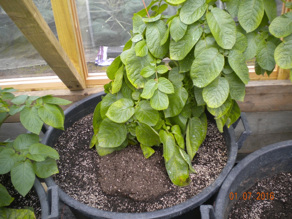 Heavy Potatoes are now showing Tuber growth, because they are not earthed up the young potatoes tend to push above the compost, covered them with fresh compost after trying to reduce to one per plant.