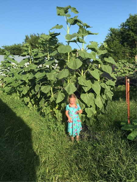 Our elder garden model, who couldn't keep her eyes open, stands in front of a sunflower that has reached 10 feet, 7 inches, and still is growing.