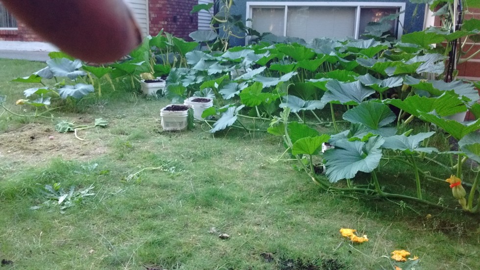 My 5 year old pollinated with aposing plants two females today while at work. Carley, on the right is in prime position. Terminated most secondaries and trained into earth buckets. The 1st pollinated on the chan is about basketball size, it is tucked behind the far left bucket. Aphids, please leave.